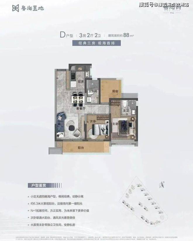 D户型:建面约88m² 3房2厅2卫