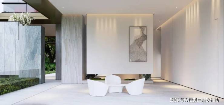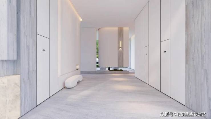 约5m挑高入户大堂;大堂点缀局部奢石+电动移门设计;结合中央空调的天花灯带造型,无主灯设计。