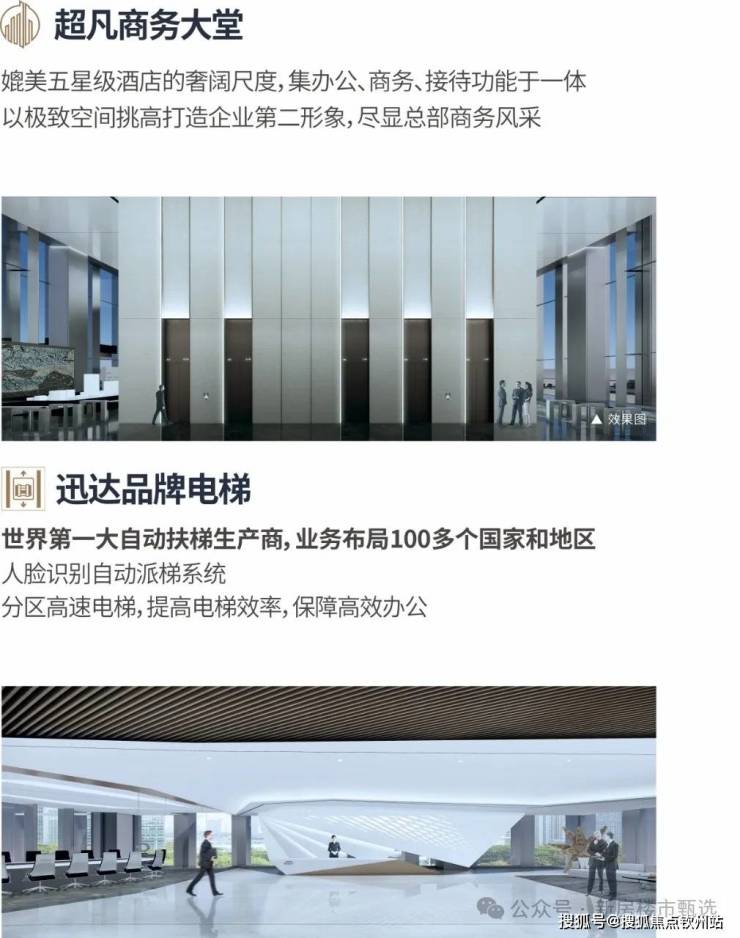 一般市场甲级写字楼层高10米左右,面积不足1000㎡,本项目T1栋约187米云端国际办公写字楼,商务大堂独具约15米挑高中空、约1500㎡奢阔商务大堂,匹配世界级办公体系。