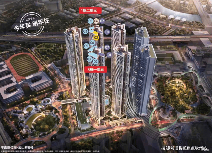 项目由8座建筑分2排组成,1栋1-2-3单元和3栋1-2单元为58-59层(约180米)住宅,标准层高2.9米,4梯6户;4栋1-2单元为35层(约165米)写字楼,2栋为幼儿园。地块住宅均为商品房性质,有1566户,配2220辆车位。