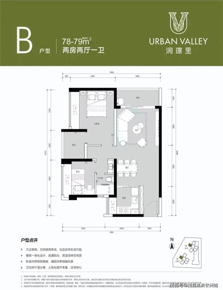 (1)79㎡三房一卫:竖厅设计,客厅开间3.5米,三开间朝南,卧室宽度3.5米/2.8米/2.3米,U型厨房,卫生间三段式分离,得房率74.44%(不含赠送),阳台西北朝向。