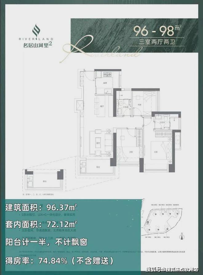 96-98㎡的3房2厅2卫(05户型),设计的是经典竖厅格局,餐客厅一体化,客厅3.5米开间,S墙设计预留冰箱位,三开间朝南,U型厨房,得房率:74.84%(不含赠送),阳台1.5米进深,东南朝向。