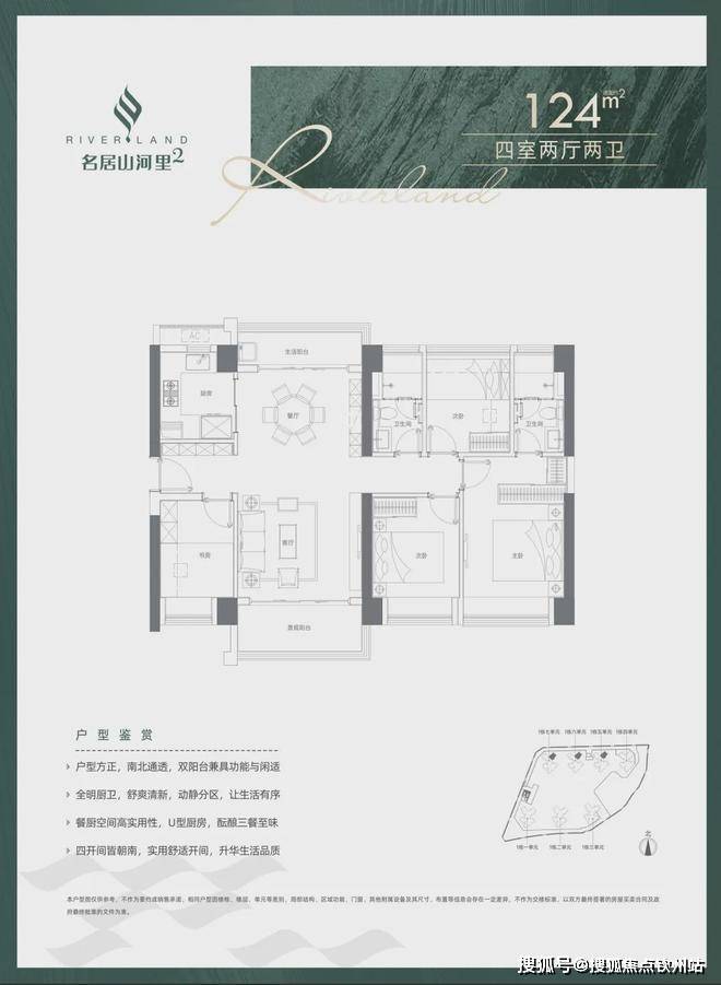 124㎡的4房2厅2卫,设计的是竖厅格局,客厅3.8米开间,南北通透双阳台,四开间朝南,全屋飘窗,U型厨房,得房率:73.86%(不含赠送),阳台1.5米进深,主朝东南向。
