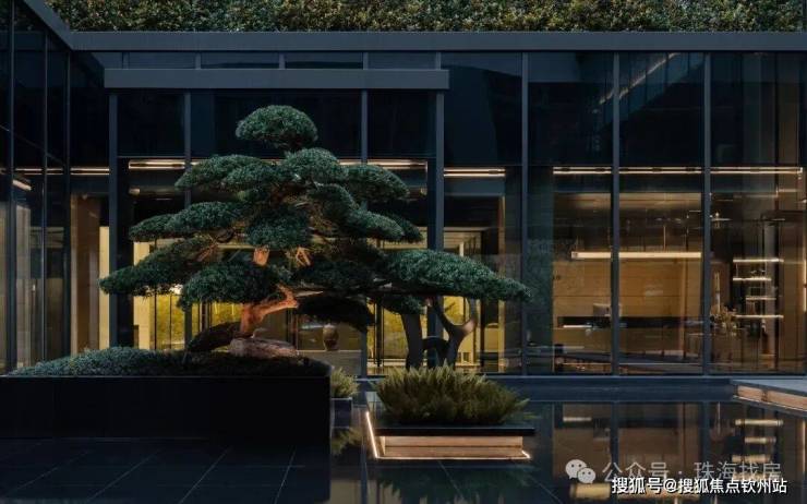 入口50米横向面宽,近6米的高跌水景墙与双层门楼让回家有了一份尊贵与隐奢;随着动线穿林,见山,伴水,来到模仿山石色调与铜色金属融合打造的酒店式大堂,一路草木清香、青石铺地、水系流动,自然的隐奢之美扑面而来。