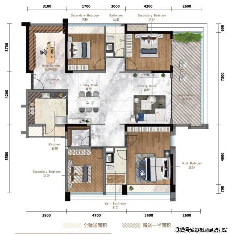 项目二期8栋02户型144㎡央景楼座户型,可瞰五桂山以及东区市区景观,还能看到星河CoCo City商超。在空间布局上,144㎡户型拥有专属入户花园,面积全赠送。