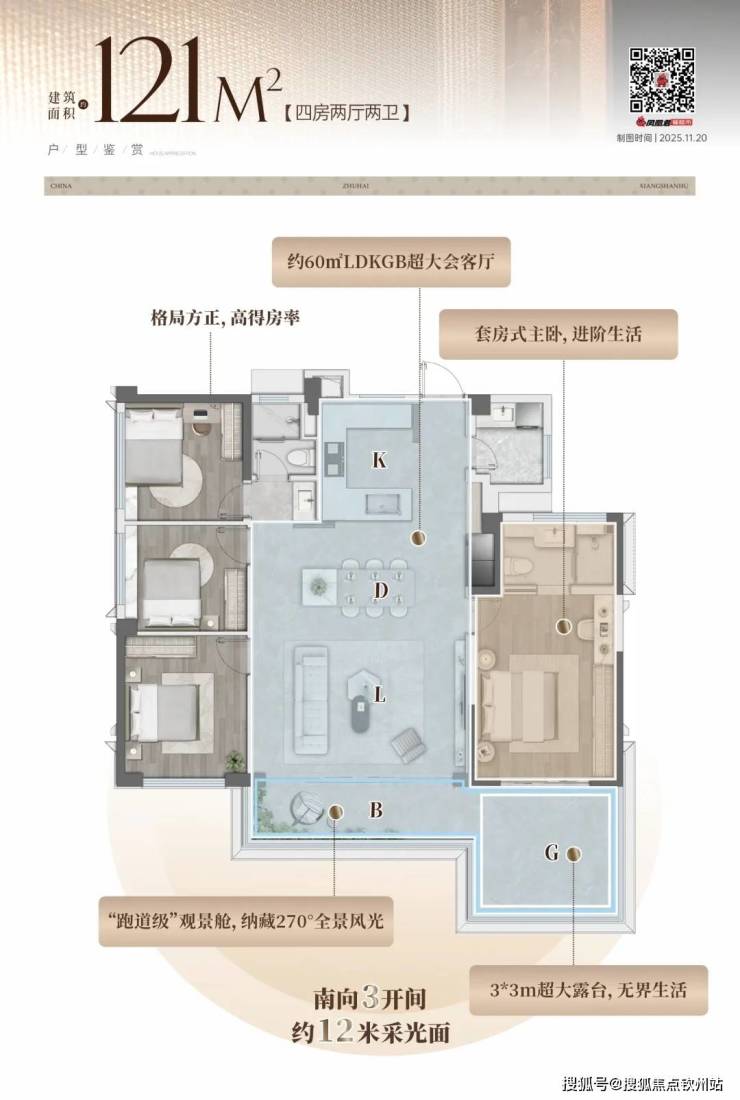 1、建面约121㎡舒适四房,拥有约60㎡家庭活动领地!
