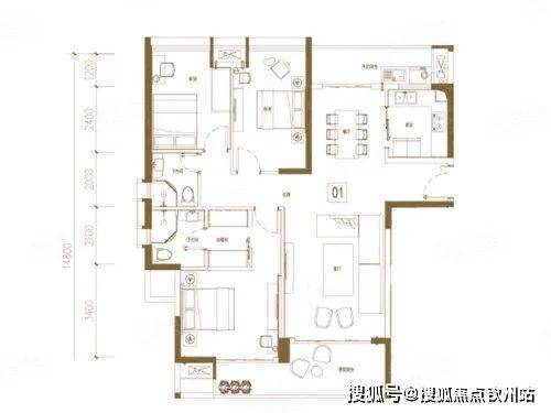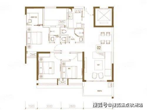 洋房户型;3室2厅2卫1厨, 建筑面积约98平米