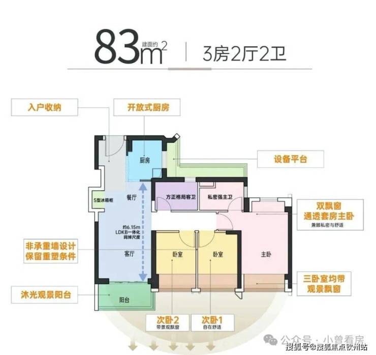 83平米三房两卫(竖厅):设计的是经典竖厅格局,客厅3.2米开间,四开间朝南,S墙设计预留冰箱卡槽位,3个卧室分别做到了主卧11.97㎡/次卧8.75㎡/次卧8.22㎡(包含墙体飘窗),公卫带1个4.68㎡的设备平台,得房率约:97%(包含赠送),西南朝向。
