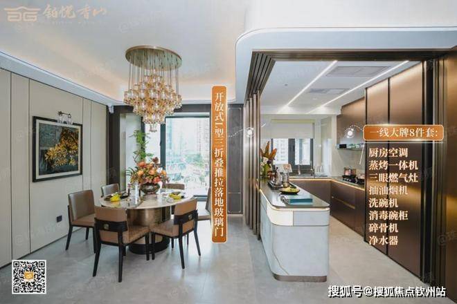 厨房开合也区别于传统墙体封闭操作,铂悦香山升级采用开放式L形三折叠推拉落地玻璃门,让厨房可以与外面空间的联系收放自如,既能增加空间的通透感,也能带来更丰富的社交场景。