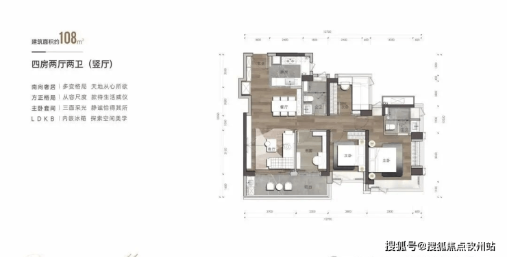 建筑面积约108㎡户型-4房2卫(竖厅)