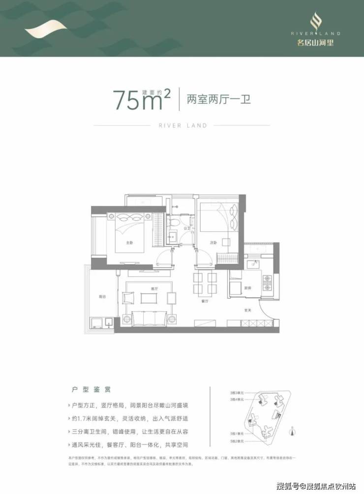 75㎡的2房2厅1卫,设计的是竖厅格局,客厅3.3米开间,LDKB一体化,2个卧室分别做到了主卧9.6㎡/次卧8.88㎡(套内面积,包含墙体),L型厨房,卫生间干湿分离,得房率:71.46%(不含赠送),阳台1.6米进深,西南朝向。
