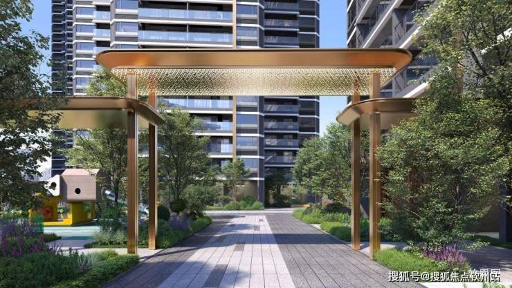 现代精奢风格打造项目景观大门;从开放景观前场→大面宽归家门堂→园林中心"森林会客花园"→风雨连廊→入户大堂,多重细节营造5重归家礼序,尊贵入户体验。