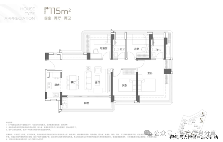 108-110㎡4房2卫户型:为西南向或东南向,竖庭设计,南北通透,阳台也是连通到次卧对出,比较宽敞。