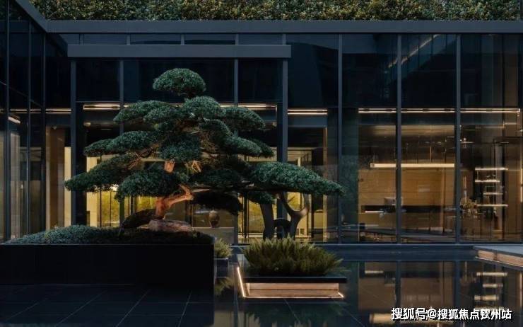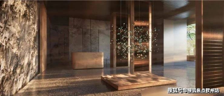 入口50米横向面宽,近6米的高跌水景墙与双层门楼让回家有了一份尊贵与隐奢;随着动线穿林,见山,伴水,来到模仿山石色调与铜色金属融合打造的酒店式大堂,一路草木清香、青石铺地、水系流动,自然的隐奢之美扑面而来。