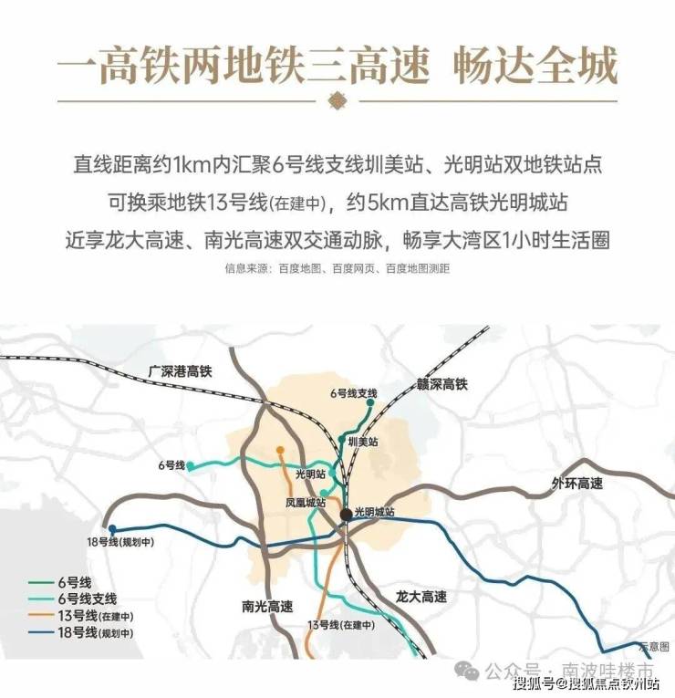 直线距离约1km内汇聚6号线支线圳美站、光明站双地铁站点可换乘地铁13号线(在建中),约5km直达高铁光明城站