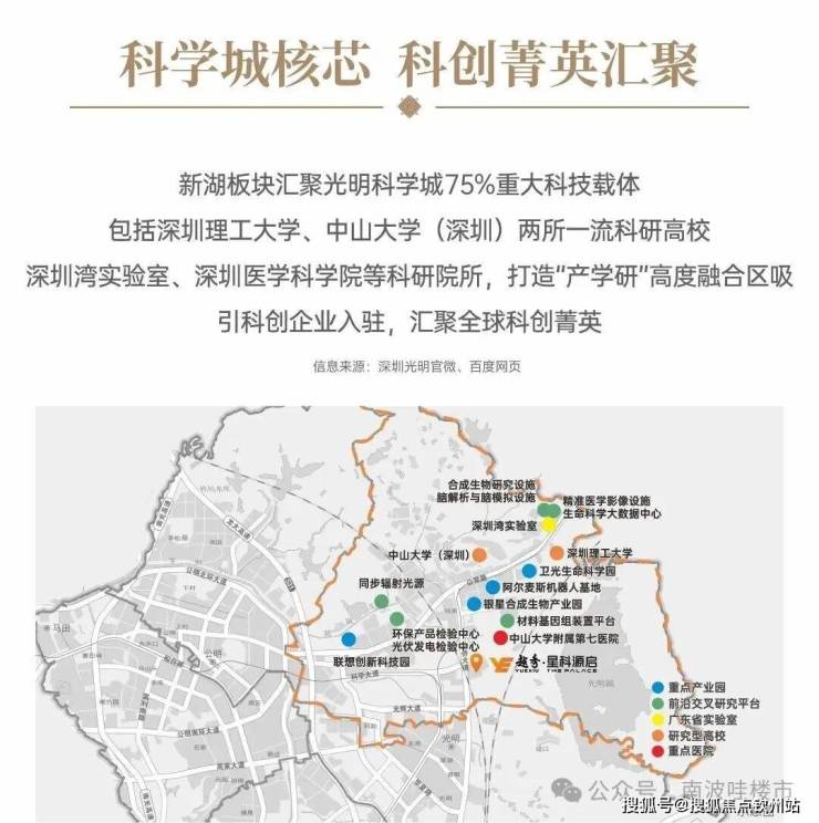 此地正是深圳重点打造的光明科学城,一个充满活力的科技创新引擎。区域内已集聚八大战略性新兴产业集群,包括生物医药和新材料,以及五大未来产业,如量子信息和脑科学,展现出强大的发展潜力。周边规划的科学岛、科技馆新馆、西方美术馆等科研文化设施,为这里增添了浓厚的学术氛围。同时,光明科学城还吸引了华为、比亚迪等知名企业的研发中心入驻,形成了“产学研”一体化的良好生态。