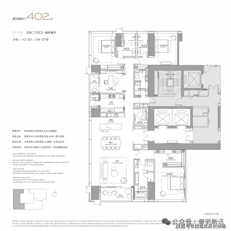 公寓主力户型为303㎡、326㎡、404㎡、572㎡等大平层,最大户型达1000㎡