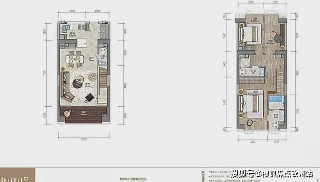 88㎡复式三房两厅三卫 南北通透,5.4米大开间,复式下层餐厨客厅连宽景阳台,复式上层私密卧房全明采光,动静分区私享个性生活。