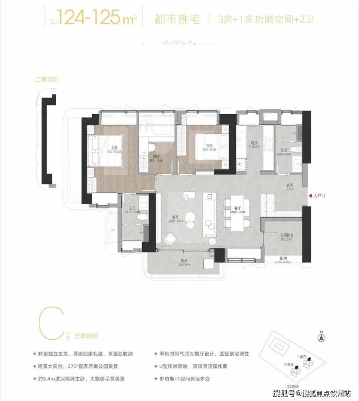 01 C户型——建面约124-125㎡3+1多功能空间 : 横厅户型,双阳台设计,西北朝向,看向绿地公园及花园。大横厅+通透采光:采用“双厅合一”的大横厅设计,摒弃多余过道,让客餐厅空间感直接拉满。