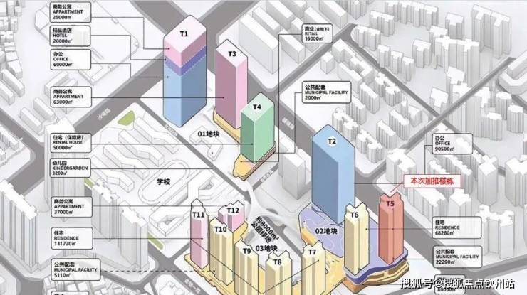 02地块共规划3栋塔楼,其中T2为办公用途,总层数50F;T5、T6为住宅产品,共计570户,层数分别为59F、58F,均为4梯6户设计,精装交付。