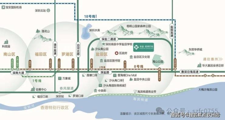 项目与8号线盐田港西站直线距离约550米,海山站直线距离约700米,2站直抵罗湖,10站直达福田CBD;且未来有18号线(规划中,海山站)。