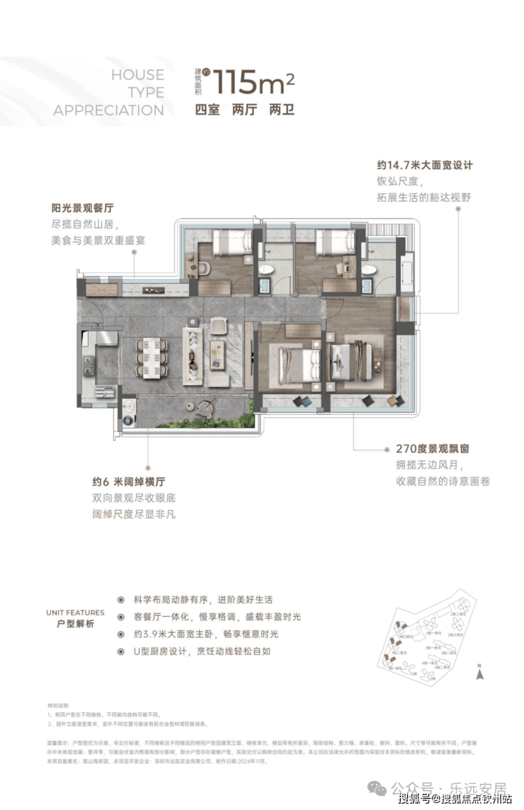 横厅南北通透格局,客餐厅6米开间,LDKB一体化,全屋飘窗,4个卧室分别做到了3.9米/3米/2.8米/2.6米的宽度,主卧加1个次卧270°全景飘窗,客厅出6米长的大阳台,L型厨房,得房率约95-97%(包含赠送),西南或东南朝向。115平米户型分布在1栋1单元、1栋2单元、1栋3单元01/02户型,01户型西南朝向都是看小区外围,02户型看向小区;