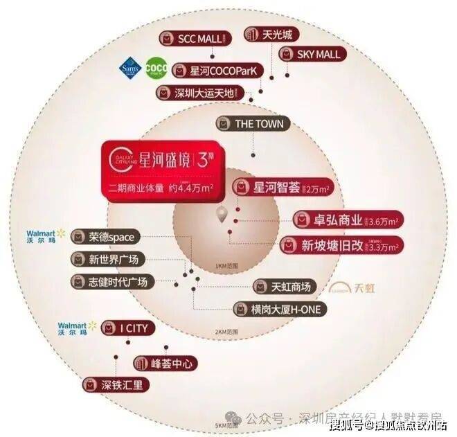 项目自身规划了约4.4万㎡的集中商业,预计2027年与项目同步开业,将满足业主的日常购物、餐饮、亲子等多元化需求。 同时,项目与周边在建的卓弘星辰(3.6万㎡)、名居山河里(3万㎡)、新世界188(9万㎡)等商业体共同构成超20万㎡的“家门口”商圈。 5公里范围内,星河COCO Park、龙岗山姆会员店等百万级商业综合体环伺,尽享都市繁华。