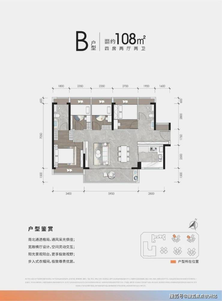 108㎡户型做的是横厅,动静分区,四房两厅一厨两卫一阳台的格局,这种户型最近几年非常常见了,优点就是横厅显得客厅更宽,有宽景阳台,室内通透性略好一些。