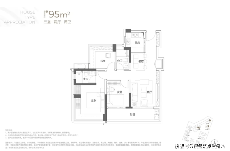 95㎡3房2卫户型:为西南向(部分户型看海)或东北向看山景,是传统的竖庭格局,南北通透。该户型得房率超89%,堪比市面上多数110㎡户型实用面积。