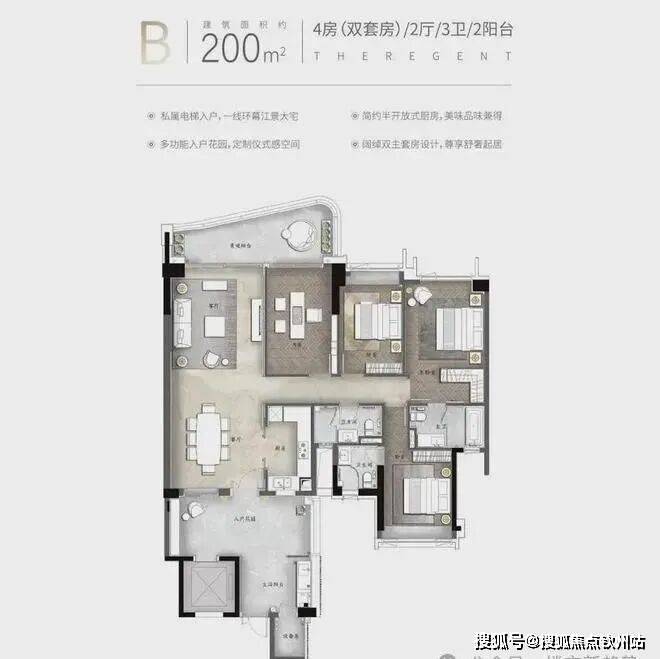 产品亮点:私家电梯入户、有天有地、部分楼层三面采光、约3.4米层高、动静分区南北对流、U型阳台360°观景、约6.8米挑空餐客厅、中西双厨、四套房设计、部分房间带阳台设计
