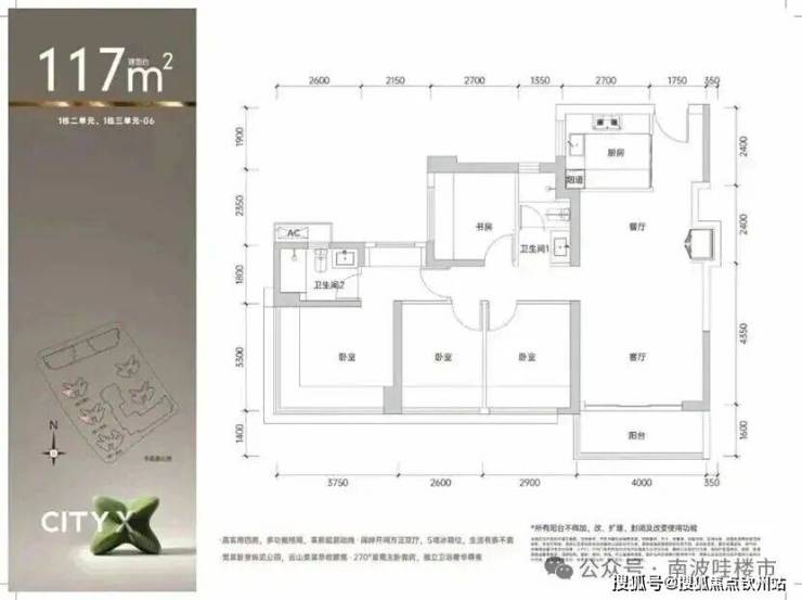108平的户型拥有约3.6米开间,全南向客厅和卧室。