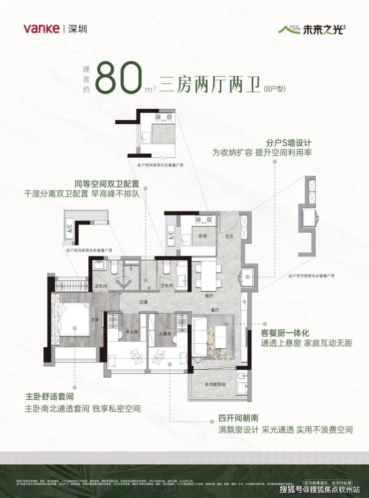 万科未来之光,最后一栋20栋一单元、二单元,!80平3房2卫,500万起!少量楼,特惠工抵房,498万起,买80平3房2卫!85折+大额返现+软装大礼包!可选楼层不多,98户型楼层可选,20栋80户型楼层可选!户型图