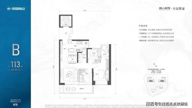 113㎡的3房2厅2卫:位于2-30F,全朝南向,带6.5米宽大阳台。