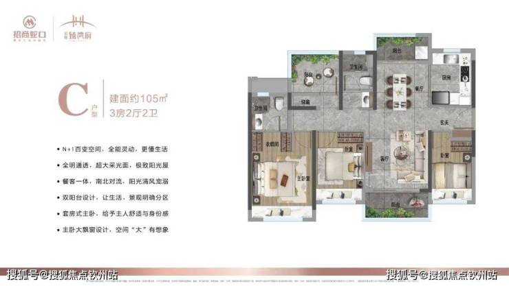 C1户型是建面约105㎡是3+1房两厅两卫,有超大采光面,全明通透,还有南向有超长景观阳台,可与三俩知己品茗茶、话人生。