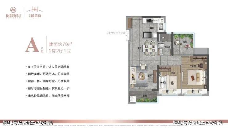 A户型是建面约79㎡是2+1房2厅1卫,L型厨房,客餐厅一体,设计通透;主次卧均带飘窗,空间感更大。