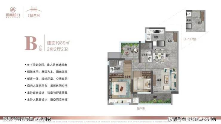 B户型是建面约89㎡是2+1房两厅两卫,三面采光,客餐厅一体,有南向大面宽阳台,主次卧均带飘窗,其中主卧带卫生间,居住舒适度更高、私密性更强。
