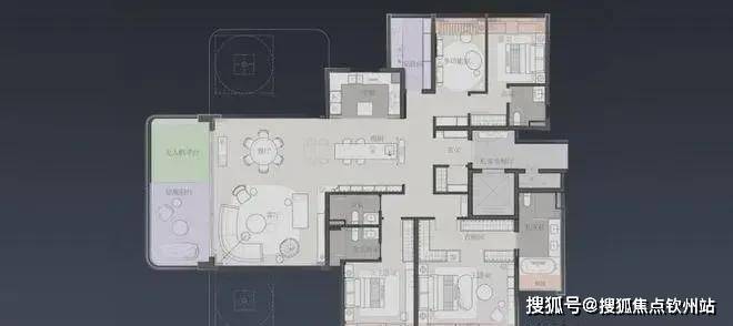 以项目约230㎡的户型产品为例,餐客厅为时下流行的大横厅设计,但以往的横厅户型,会与起居或功能空间放在一起,牺牲掉部分私密性。