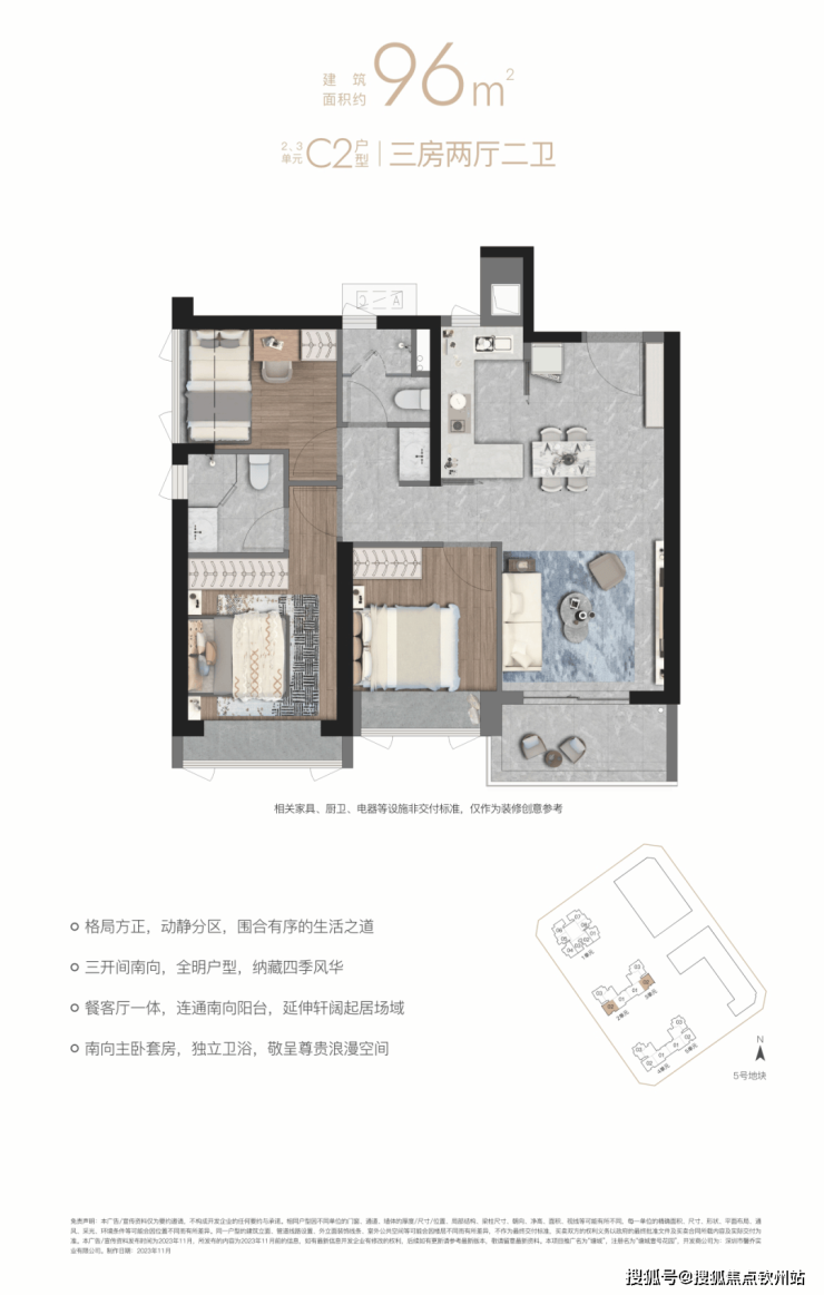 “10.7 m纵深紧凑南向三房”,10.7 m纵深餐客一体,通风采光极佳