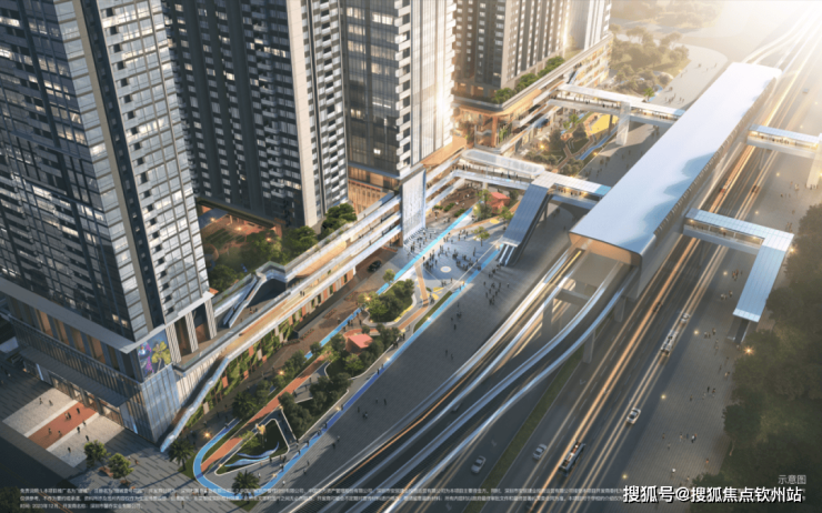 垂直交通场景:多首层设计,空中连板、无风雨连廊等,形成住宅、商业、办公与地面公交、空中地铁的接驳体系。