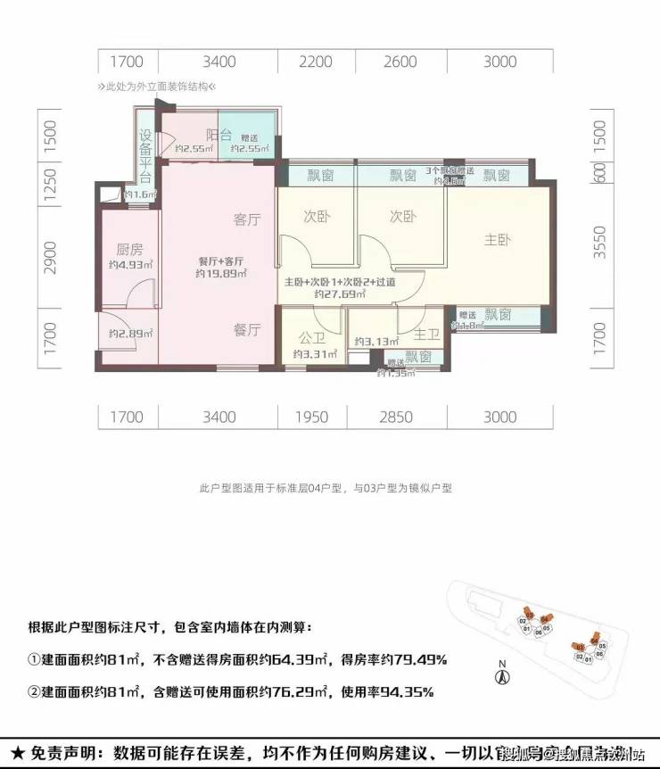 81㎡的3房2厅2卫,设计的是竖厅南北通透格局,客厅3.4米开间,3个卧室分别是3米/2.6米/2.2米的宽度,L型厨房,得房率:94.35%(包含赠送),阳台西北或东北朝向。