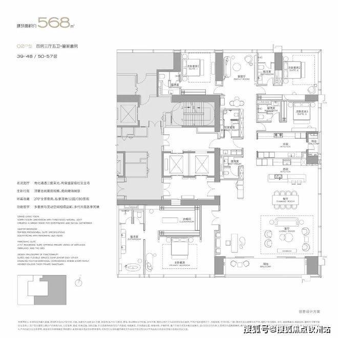 南北通透三面采光,顶奢总统套房规格,270°全景套房,享受湿地/公园/CBD景观,都是套房设计,更具私密性,中西厨分离。