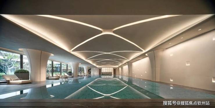 沿着 3 旋 720 度的旋转扶梯来到负一层的 JUN CLUB,环绕式布局和中心下沉式琉光水院,让室内外景观完美融合。这里的四大场景空间面积达 3000 多㎡,超越星级酒店的穹顶式高奢恒温泳池,顶部精致的艺术穹顶、落地玻璃窗、弧形转角立柱、暖光壁灯等,将静奢主义美学展现得淋漓尽致。