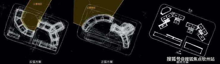 为充分考虑南向城市界面与北向珠江沿岸界面,经过建筑师多轮方案讨论及推敲,提出了环抱式规划方案。
