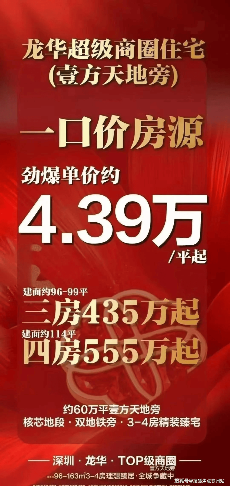 项目现在推出一口价房源,单价4.39万/㎡起!96㎡3房总价435万起,4房总价555万起!等于在原来88折基础上,总价再减约60万!目前还有少量一口价房源!