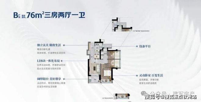 76㎡的3房2厅1卫,设计的是竖厅格局,客厅3.05米开间,入户玄关八宝库,LDKB一体化,S墙设计预留冰箱卡槽位,U型厨房,卫生间三段式分离,还送1个设备平台,得房率约75.9-76.6%(不含赠送),1单元01户型东南朝向,2单元01户型西南朝向,05.06户型东北朝向。
