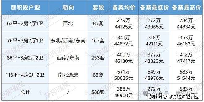 宝安沙井,卓越前海未来城(备案名:蔚蓝海尚花园)于2025年4月18日取证入市,本次推出1栋1/2单元,共588套房源,面积有63㎡的2房1卫,76㎡的3房1卫,86㎡的4房2卫,113㎡的4房2卫户型,备案均价4.59万/㎡,备案单价4.21-5.15万/㎡,总价272-583万/套,预计在2026年12月份带精装交房。