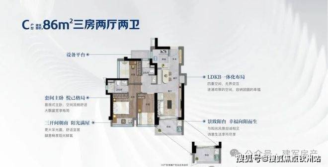 86㎡的3房2厅2卫,设计的是经典竖厅格局,客厅3.2米开间,入户玄关八宝库,LDKB一体化,S墙设计预留冰箱卡槽位,动静分区,三开间朝南,U型厨房,公卫三段式分离,还送1个设备平台,得房率约75.9-76.6%(不含赠送),西南或东南朝向。