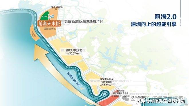 前海8倍扩容,宝安形成“南宝中、北会展”双中心发展格局。从前海1.0(妈湾、前湾、桂湾片区)到前海2.0(会展海洋城),多重战略加持下,成为深圳向上发展的核心引擎。