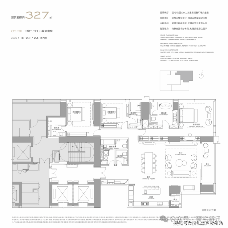 面积设计:300、400、460、570、1000平米纯粹大户型,空间方正,极致私密。