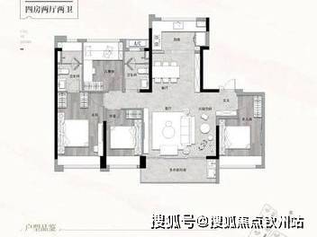 98㎡四房两卫:得房率 80.69%,竖厅格局,LDKB 一体化,四开间朝南,U 型厨房,卫生间干湿分离。